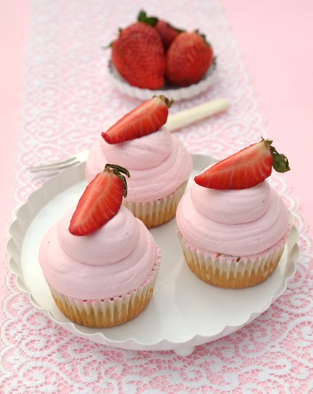 4. A habdíszítéshez kevés édesítővel verd fel a tejszínt, ha már elég kemény a hab, keverj el benne egy 1 ek. pürésített Update1 eperdzsemet és egy pötty természetazonos ételszínezéket. Nyomózsákkal nyomj a muffinokra csinos kupacokat a habból, ennek a tetejét eperszelettel díszítsd.